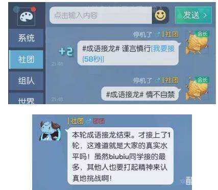 每日的12:15和21:45,社团频道会有系统信息通知:【在社团频道输入“成语接龙”可以开启成语接龙游戏哦~】收到信息后,即可开始成语接龙游戏啦~