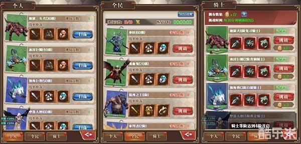 3.不愿意透露姓名的大佬C:获取极品当然是打boss啊!提升战力的另外一个重要的途径,当然就是提升装备了,把自己武装到牙齿,再厉害的敌人都不是什么难题了!BOSS战是获取角色装备的主要途径,游戏中提供了个人BOSS、全民BOSS、联盟BOSS、骑士BOSS等多种BOSS,每种BOSS均会随着玩家等级的提高而不断开放新的BOSS。