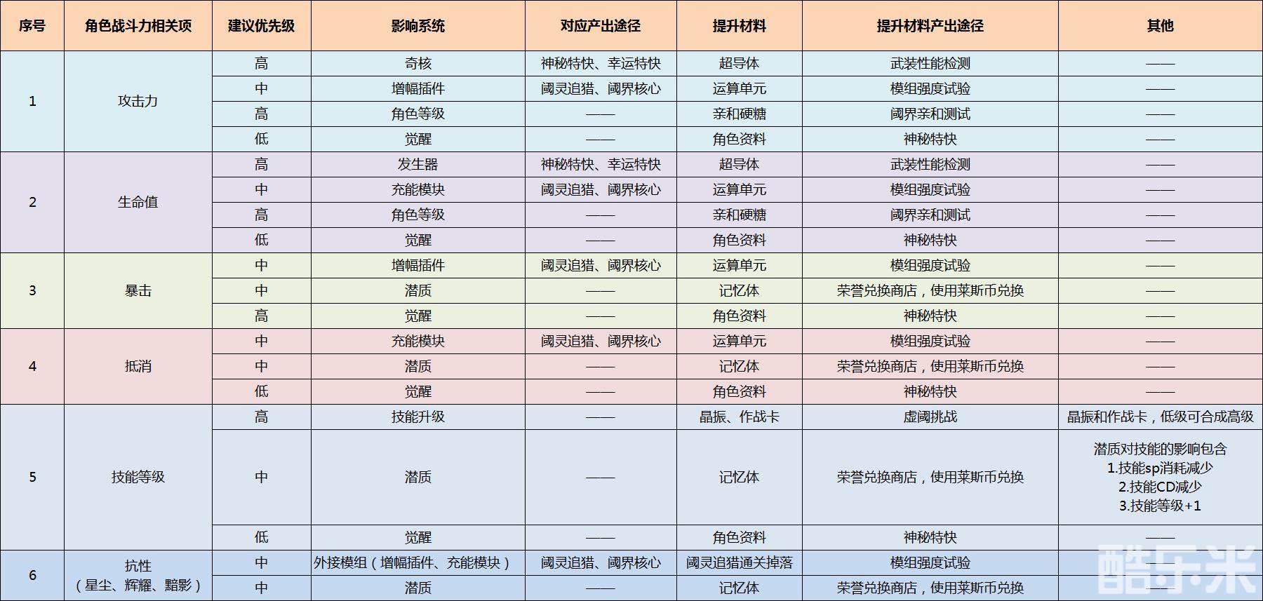 每一名角色的战斗力由6个不同的因素构成:攻击力、生命值、暴击、抵消、技能等级、抗性。至于每个词条的作用,游戏内的《白翼手册》有对应解释。这里直接给出各个词条的提升对应强化项目,当遇到需要强化某个词条时即可参照本表格,直观找到提升方法。