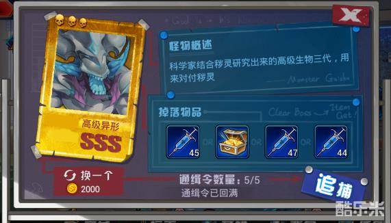 通缉令获得的奖励可以激活基因的基因药剂,可以并且每个小时增加一个通缉令,上限5个,打通缉令的怪如果打不过可以马上退出,不会扣掉通缉令,然后使用2000金币刷新怪物和奖励,难度有S、SS、SSS三个难度.