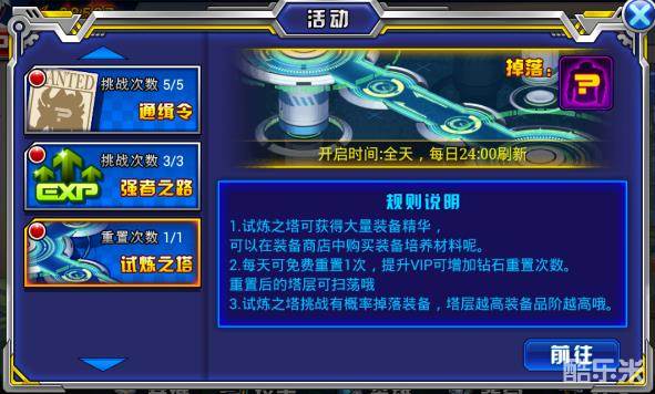 试炼之塔是25级开启,也是装备、钻石、经验和体力的一个获得方式,并且VIP7每天可以重置2次,VIP9每天可以重置3次试炼之塔,是获得最多资源的方式.