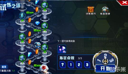 试炼之塔点击开始会后会随机转到一个数字,数字代表走的格子数,有3次的免费指定点数,3次之后每次指定点数都需要10钻石,如果中途有装备宝箱或者钻石可以考虑使用钻石指定点数,指定点数不能超过上一层的BOSS关,因为超过也是会停在BOSS关.
