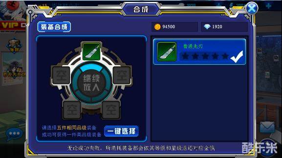 如图,需要相同品质的5件装备,就可以合成一键更高品阶的装备啦!当然,如果想快速获得紫色或金色装备的话,也需要一点点运气啦,(*^__^*)嘻嘻……