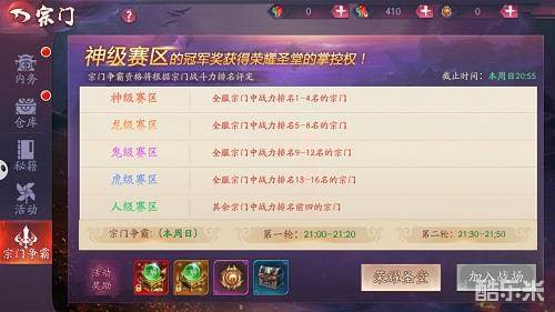 宗门争霸会依据宗门战力排名划分多个赛区。1-4名为神级赛区;5-8名为龙级赛区;9-12名为虎级赛区;13-16名为地级赛区;其余宗门中的前4名为人级赛区。每个赛区的冠军可晋升到更高级赛区,末位将下降到低一级赛区。
