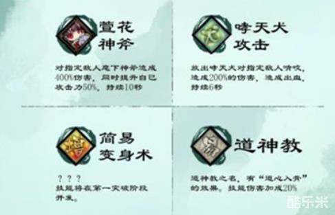 道神教:可以提高自身的技能伤害,本来杨戬的技能输出就很高如果可以再次提升技能伤害的话可以对目标造成高额的伤害,建议开局就使用,这样之后的攻击效果会更好。
