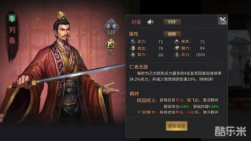 先看属性,刘备是弓系武将,基础属性为:武力73(打架还是他的弟弟们比较猛),统率75(调兵遣将还是诸葛亮比较强),政治78(刘备知人善任这方面还是可以的),魅力99(看看刘备手下的人马就知道了),智力88(不聪明怎么当一国之君),兵力1000。