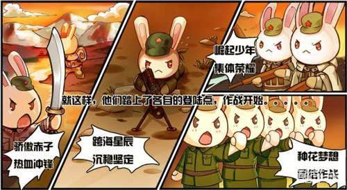 此次军演分为四支队伍,分别是:骄傲赤子、跨海星辰、崛起少年和种花梦想。亲们可随意加入某只战队,在限定时间内占领城池最多的就是最强兵团。每只战队为了鼓舞军兔们的士气都设定了自己的势力宣言,骄傲的赤子战队宣言:不要啰嗦一大堆,加入骄傲的赤子,拿起武器就干;跨海星辰战队宣言则是:老司机带人从不翻车;崛起的少年战队也不示弱,他们的宣言是:奔跑吧,崛起的少年,胜利的歌我要再唱一遍;种花家的宣言就比较“文艺范儿”了:种花家是生产奇迹的地方,而创造奇迹的就是种花梦想。心中有梦的四只战队就这样各自踏上了登陆点,作战即将打响。