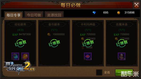 一键领取功能固然好,但在目前版本的《全民奇迹MU》副本系统中,除日常副本、多人副本与跨服副本三部分能够一键领取之外,剧情副本与万魔塔虽然也能进行扫荡,却还是需要勇士们亲自到副本系统界面中去完成才行。