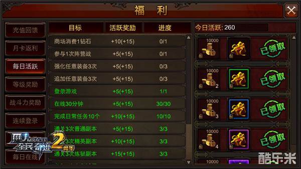 战斗与冒险固然热血有趣,领取《全民奇迹MU》为大伙儿准备的每日豪礼福利则更是激动人心。每日活跃、连续登陆、每日奖励等一系列日常福利,勇士们在完成了大多数日常游戏内容,活跃度达到一定数额,在线达到一定时长之后,便可以到福利系统中一一领取了。特别的,若是遇上《全民奇迹MU》举办庆典活动,每天领取的福利奖励又将上升一大截。