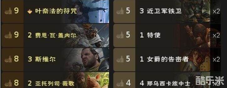 在战术间谍这个卡组里面,主要依靠的就是卫士来保护铁卫,毕竟在更换了领袖之后这个卡组的战场能力就减弱了,但是在卡组展开的随机性和核心点也变多了,不过这样一来对于玩家的操作要求也有了非常大的难度提高,毕竟玩家在游戏里面不可能让自己的卡牌全发挥出最大的战斗力。