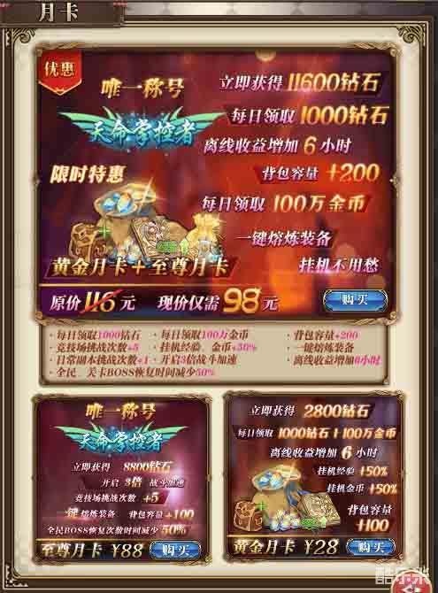 月卡页面位于游戏主界面的左下方,点击月卡按钮即可进入月卡页面。月卡分为至尊月卡及黄金月卡两个种类。黄金月卡包括购买后立即获得的2800钻石,每日可领取定额钻石及金币。购买以后离线收益,挂机经验及金币等都会有相应的增加。此外,背包容量一会扩充,妈妈再也不用担心我因为背包满了而无法继续获取收益啦!