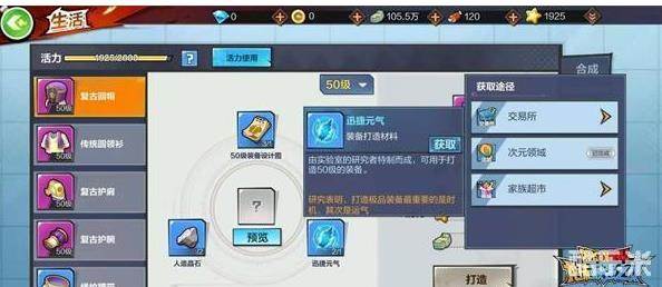 除此之外,装备打造还要消耗一定数值的活力和索尼币。索尼币的获取途径非常多,小编在这里不再赘述,主要是说明一下活力的来源和用途:玩家进行日常活动时获得的活跃度会换算成活力,1点活跃度=5点活力,活力可以进行采集、采矿、种植、垂钓,或者在活力使用中消耗活力兑换资源。