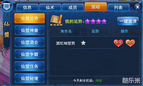运势可以通过仙盟成员之间的相互祝福进行提高,也可以邀请盟友对自己进行祝福,每人最多进行20次祝福。运势将会直接影响到当日仙盟任务、仙盟酒会的奖励加成比例,以及击杀仙盟BOSS、挑战仙盟秘境时双倍掉落率。运势越高,奖励加成比例和双倍掉落率越高!每日6:00运势将会归零,如果中途退出仙盟的话运势也将归零。