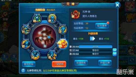 修仙之人不仅要外修技能,更要内修元神,元神的境界越高,属性加成或上限越高(普通用户可同时修炼一个元神,VIP用户可以额外开启两个等待序列,VIP卡可在商城购买,邀请在线好友可缩短修炼时间)当当前阶段的元神修炼完成是便可以提升阶段。