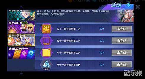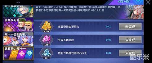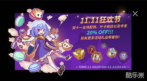 本次双十一活动,活动期间全场配饰、叶卡商店以及夺宝限时8折!同时,还有双十一钻石助力,人人可购心仪皮肤!活动共分为4天每天刷新任务内容,守护者们千万不要错过每一天的奖励噢~持续时间11.08-11.11日!