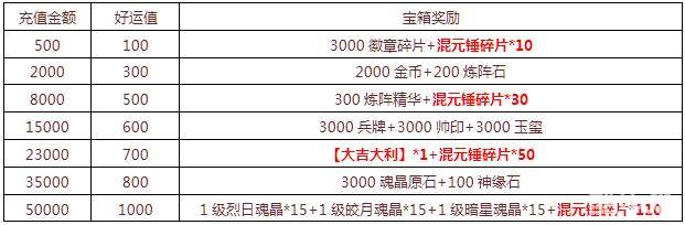 【活动内容】活动期间可通过充值金币获得好运值,积累好运值即可打开宝箱奖励,闪耀称号,全新神器,绝对超值的提升战力资源,尽在特惠好礼。