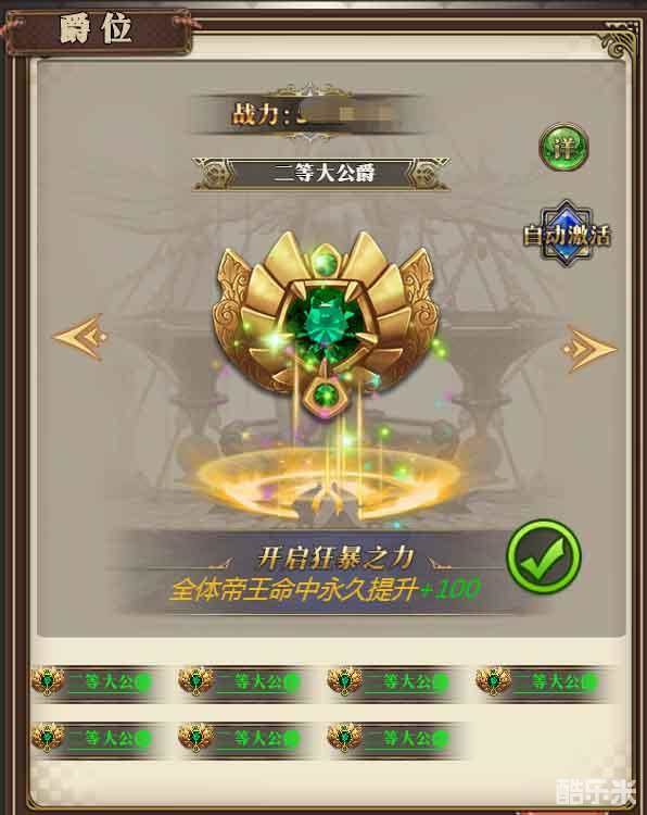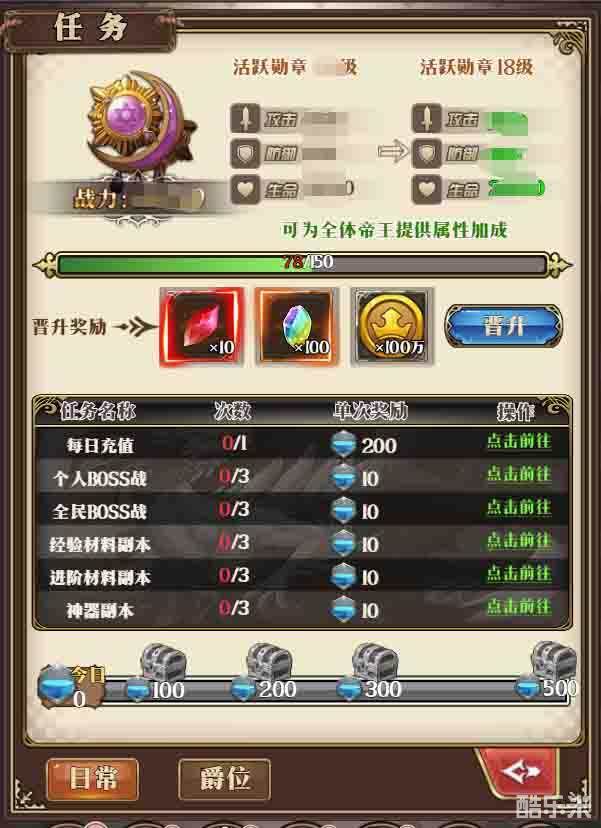 除了活跃奖励以外,累计获得一定的活跃度即可得到晋升,玩家不仅可以获得晋升奖励,对玩家攻击,防御以及生命等方面亦会有一定的提升,提升战力就是这么轻松简单!除了完成日常任务以外,历程系统当中的爵位功能亦是我们变强的极佳途径!当我们在关卡战斗当中通过指定关卡时,即可获得爵位称号。集齐一定数量的爵位称号即可激活爵位称号,从而提升自身战力。