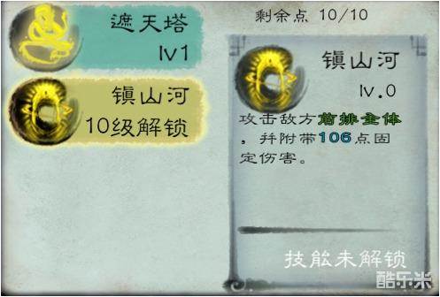 镇山河:攻击敌方前排全体,附带106点伤害。