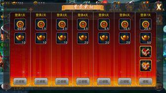 首周每日登录游戏,即可获得对应天数的元宝、铜钱,第七天登录,还可额外获得元宝宝箱,可开出20-100元宝。