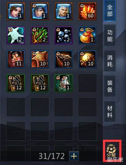 在版本更新后,背包切页的右下方将会出现一个分解按钮,点击后即可进入分解页面。
