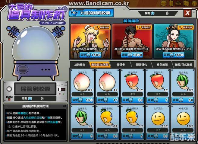 通过大尼的道具制作机玩家们可以兑换龙的礼物、宠物礼物、徽记卡、额外强化、角色换装以及花式技能,还可以兑换凌云壮志角色包,道具会保管到时间胶囊里面。