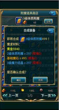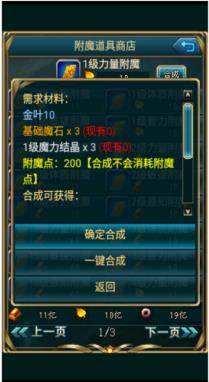 高级VIP玩家可在附魔道具商店选择一键合成功能,点击【合成】-【一键合成】即可。合成时输入需要合成的数量后,会提示一共需要消耗多少合成材料和黄金,玩家进行一键合成操作时一定要留意背包内携带的材料是否足够哦。