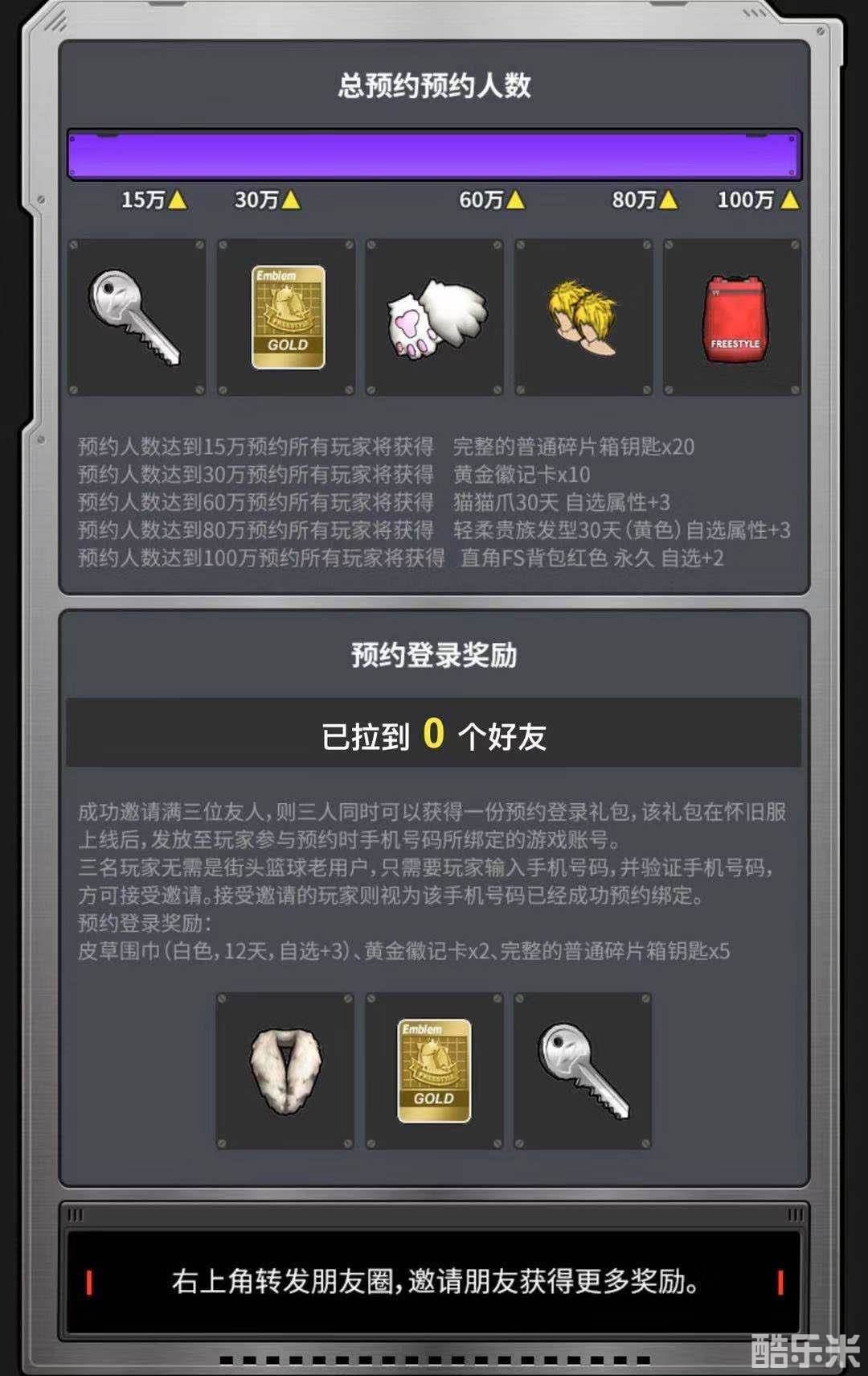 预约每达到一定人数就可以获得相应的奖励,分别是20个完整的普通碎片箱钥匙、10张黄金徽记卡、30天自选+3猫猫爪、30天自选+3黄色轻柔发型以及永久自选+2直角FS背包。