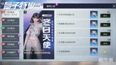 超能特工可通过“冬日新衣”系列活动,收集彩星、兑换这套全新套装!与好友组队参与竞技、累计生存时间、累计参战场次,以及累计击败敌人数量等,均可获得不同数量的“彩星”——只要入场竞技,人人都能穿上新衣,展现纯白冬日风情!