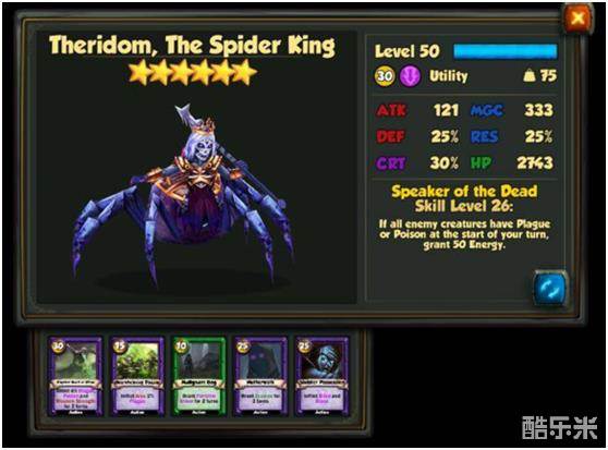 从数据看出来,蛛王血量超高,但是双防和双攻都很蛋疼,所以定位一般都是作为pvp首发消耗对方然后攒能量的(其实。。瘟疫叠上去之后很疼的,不净化的话,全场有效没有回合限制),卡牌组合十分好,完全是为了这个被动而组的!