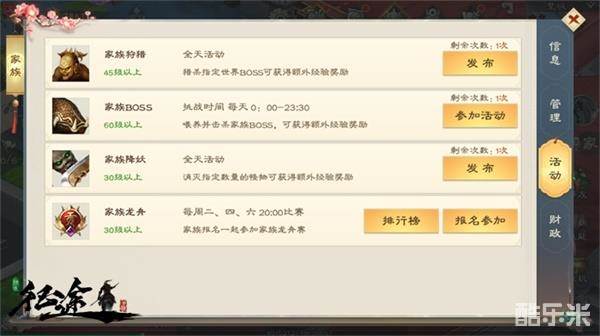 首先在社交玩法中我们可以找到家族系统,然后我们选一个合适的加入就可以了,当然你也可以直接创建一个家族邀请各方好友来加入。家族玩法中包含家族狩猎、家族降妖、家族BOSS和家族龙舟,玩家们超过30级都可以参与一下。