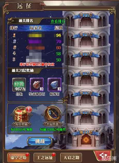 虚空塔是游戏中提升等级的重要途径,通关虚空塔可以获得海量的角色经验,帮助玩家快速提升等级。玩家还可以在每日0点以后获取大量的经验和强化材料,消耗钻石可获得双倍奖励。玩家每通过10层即可在幸运转盘进行一次抽奖,掉落的奖励均可用于各项强化当中~!