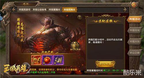 在当前新服开启第14天后,每周二21:00—21:30即可参与这场盛宴。届时玩家将以区服为单位进入世界区。活动中每个出生点区域有三个图腾,玩家可以前往其他区服的出生点占领图腾获得积分;亦可通过杀人、杀怪获得个人荣誉积分。活动结束后,将根据积分排名领取丰厚奖励。