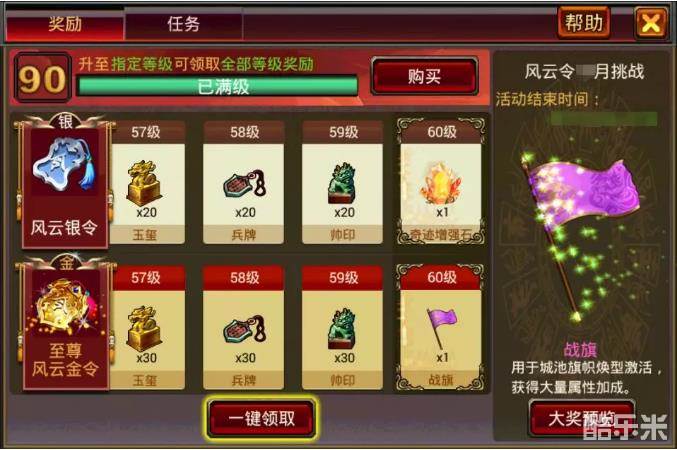激活后,可以通过金币直接购买风云令的等级,升级到指定等级可获得城池焕型的珍稀筑城令以及战旗。