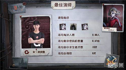 本周监管者的最佳演绎为Gr丶皮皮限在对阵SGmrc战队的第三局上半场扮演的红夫人。比赛中,Gr丶皮皮限的红夫人开局就与大副贴脸相遇并在开局阶段就成功逼出一块怀表,率先掌握了本局比赛的节奏。紧追不舍的红夫人在大房外楼梯成功击中开了第二块怀表的隐身大副,并利用镜像技能把大副逼在窗口,将大副击倒挂椅。大副作为求生者方破译密码机的主力开局被挂,形势对求生者方已颇为不利。前往救援的野人与红夫人在被挂的大副周围连续展开攻防博弈,野人试图压满血线在最后时刻救下大副,却在即将成功之时被红夫人打出恐惧震慑,大副被挂飞的情况下,野人还被挂椅,此时尚有五台密码机未被破译,红夫人完全掌握了场上的节奏。野人在被惊险救下后,仍然不能逃脱红夫人的追杀,在地下室被再次挂椅。佣兵再次救援后,却无法为野人挡刀,甚至自己交护腕失误,造成了救人双倒的局面。冒险家被击中一刀后,连续放板试图逃离,但被红夫人开启镜像后一刀击倒。此时场上求生者只有一个半血的佣兵,红夫人放下冒险家后,利用镜像靠近佣兵,直接打出恐惧震慑击倒佣兵。最终,Gr丶皮皮限的红夫人在里奥的回忆收获四杀终结比赛。