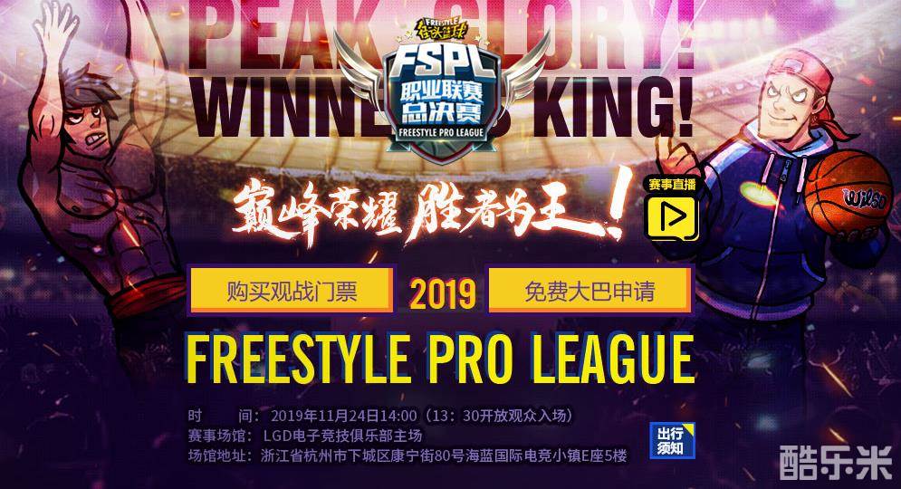最后编辑于6年前2019《街头篮球》FSPL职业联赛总决赛将于11月24日在杭州LGD电子竞技俱乐部主场盛大举行,亲临现场为FSPL职业战队加油,享受VIP礼遇,6支最强战队已经集结,FSPL总决赛专题也已经正式上线,不在现场的观众可以通过官网观看斗鱼直播,还能赢取极品道具!