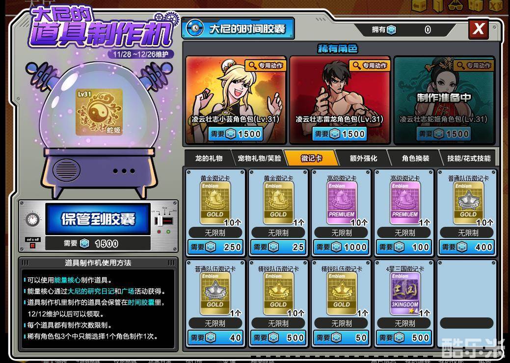 活动开启后,玩家可以通过参与大尼的研究日记和广场活动获得能量核心,能量核心可以用于制作道具。道具制作机里的制作的道具会保管在“时间胶囊”中,12月12日服务器维护后可以在转送中领取。每个道具有制作次数限制,稀有角色包3个中只能选择一个角色制作一次。