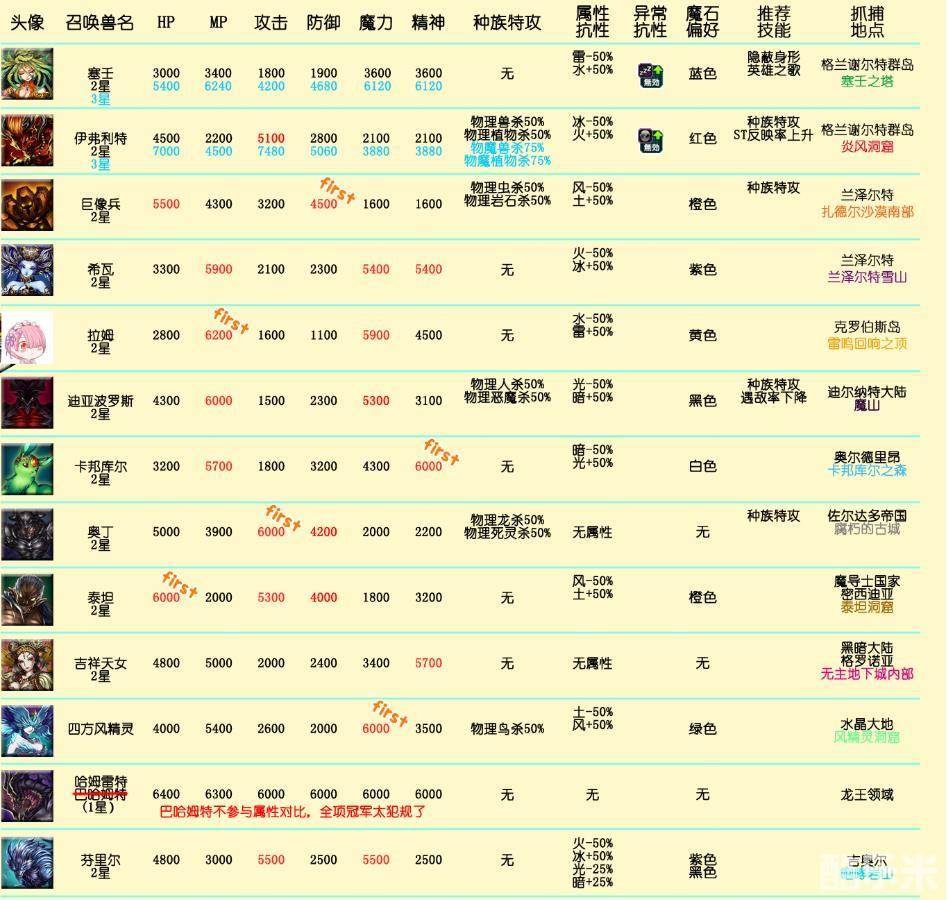数据来自FFBE国服wiki,属性为二星40级属性,其中部分召唤兽蓝色字体为三星60级属性