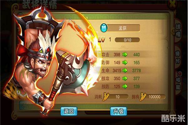 武将升级:顾名思义,就是提升武将的等级。每一次升级都可以提升武将的基础属性和战力。在游戏中,除了副本战斗可提升武将等级经验外,也可在聚义厅中点击武将,在武将详情中,点击升级消耗粮食来提升武将的等级。