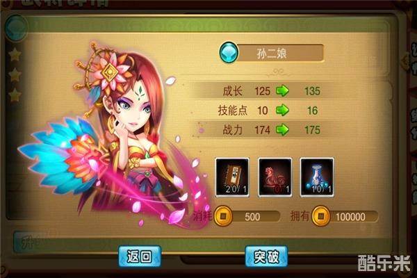 武将突破:武将最多可突破20次,每一次突破都可以提升武将的成长、技能点和战力。在游戏中,于聚义厅中点击武将,在武将详情中,可以点击突破,消耗突破材料和铜钱来提升武将的突破次数。