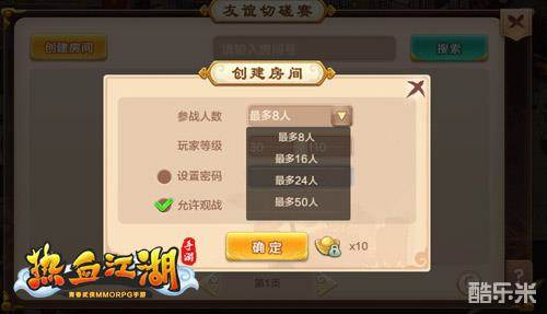 只要玩家达到30级都可前往柳正关银总事处报名参与友谊切磋赛。玩家可花费一定绑元自建房间也可加入别人的房间,红蓝阵营可根据自身情况选择,长时间未选择阵营摇摆不定的墙头草是要被踢出房间的。队伍参战人数是由房主来设定的,参战人数可有8人、16人、24人、50人多个设定选择,要开多大局全凭你做主。