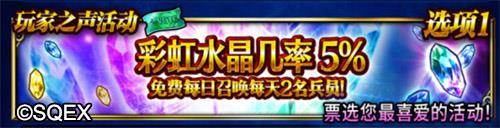 召唤(投票)彩虹水晶几率5%卡池活动的玩家占多数的话,会在下一阶段每日免费召唤2名兵员,虹率为5%