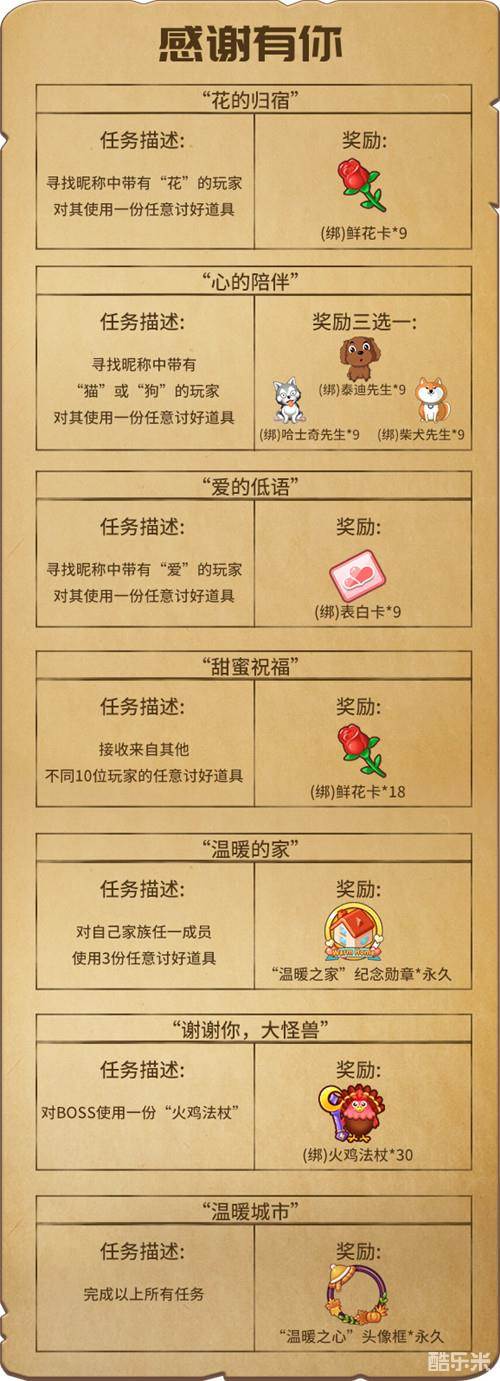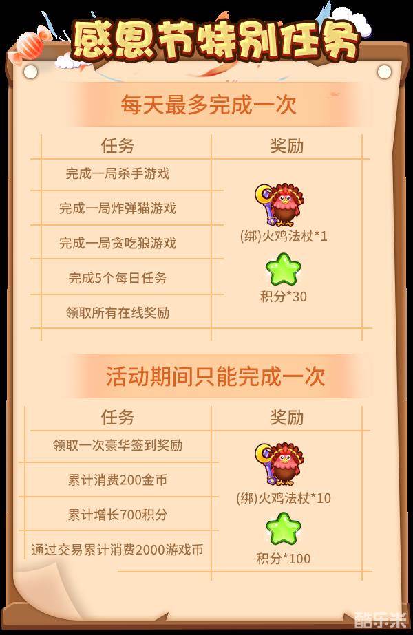 活动期间,完成感恩节特别任务,即可领取对应奖励!