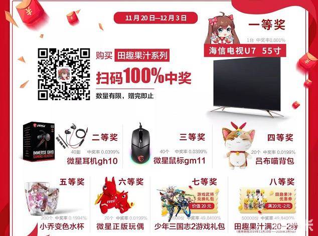 不止有物美价廉的果汁喝,喝完果汁还有大奖奉送!活动期间,购买定制款包装的田趣果汁,微信扫描瓶身二维码即可进入专属活动界面,参与100%中奖的超福利的大抽奖!一等奖是55寸海信大彩电一台!此外,更有微星耳机、微星鼠标等外设好礼;吕布喵背包、小乔变色水杯、微星正版玩偶等周边大礼等你来抽取!