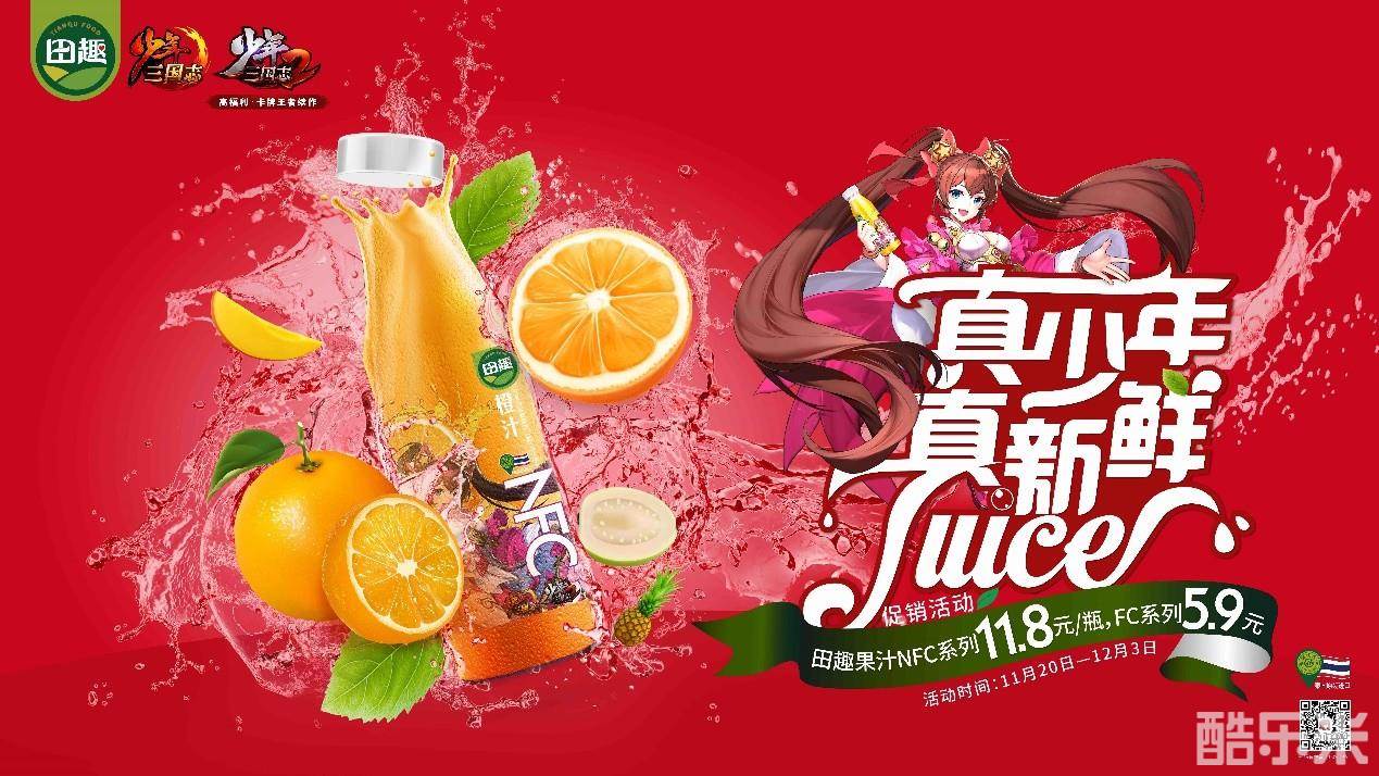 少年感满满的田趣果汁堪称果汁新生代的王牌,与《少年三国志2》同样有着充沛的热血活力!100%鲜榨的田趣果汁,甄选全球水果供应商,用自然成熟的鲜果萃取,再通过国际先进的冷链灌装技术锁定水果的新鲜与营养,保留水果99%的营养成分,可谓是好喝又营养的臻品饮料!而此次联动,还有多重福利加持,让你轻松喝上田趣美味!