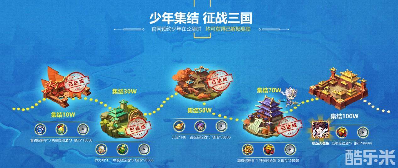 同时,公测预约活动目前也在火热进行中。只要达到一定的集结人数,所有参与预约的玩家就可在游戏公测时领取高级招募令、顶级经验酒等丰厚豪礼!达成100万集结更有绝版头像框相送!此外,《少年三国志》一代老玩家回归还能享受多重福利,绝版称号“荣耀少年”尽显你的丰厚资历!目前,已有逾50万老玩家参与回归《少年三国志2》,说不定其中就有你曾经的战友!参与预约,与好友一起爽快三国!