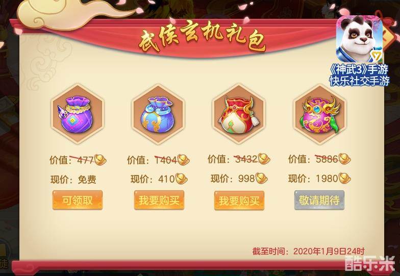 为庆贺武侯府开宗立派,《神武3》手游特上线武侯玄机礼包,2019年11月22日9:00—2020年1月9日24:00期间全服限时上架!所有≥30级的玩家满足登录天数和活跃条件即可免费领取内含宝石包、洗宠券等实用道具的第一档礼包,同时还有三款超值特惠礼包任君挑选,其中第四档礼包将在11月29日9:00后开放购买,福利多多不可错过。