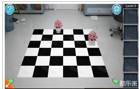 3.收集照片墙桌子上的两盆花,将花盆放到地上黑白格子的圆点处。