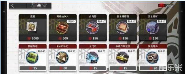 聚酸酯组*40,RMA70-12*30,龙门币15万,中级作战记录*150,家具零件1000
