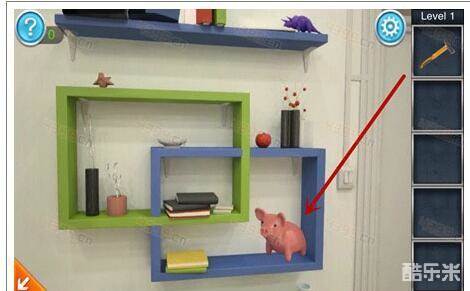 3.点击门的左边架子,发现小猪存钱罐,用锤子将小猪打破,可获得硬币。
