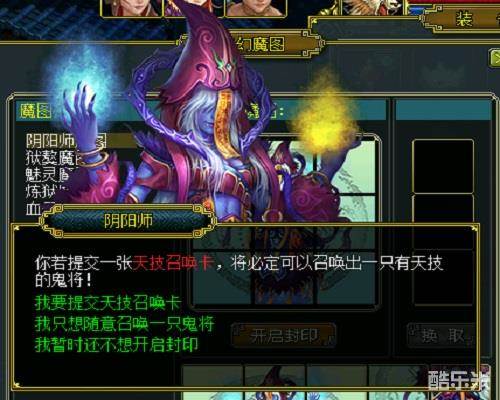当你挑战成功后便会获得一张鬼宠残片,残片一共九张,每次挑战结束以后,都会随机获得九张中的一张。其余挑战的玩家也将每人获得一张鬼宠残片。当我们将九张残片收集完毕以后就可以在神幻魔图界面中点击开启封印了,系统会要求你选择你所要获得的阴阳师的类型,即体,力,敏,灵。玩家们收集完毕后可根据自己所需要的类型来开启封印。可以从商城购买一张天技召唤卡,就可以召唤出带有天技的鬼将了!